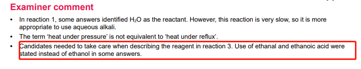 这道题在反应1中,有些同学将H2O确定为反应物。但事实上这个反应非常慢,所以用碱水是更合适的。另外同学们在描述反应3中的试剂时需要注意,有些同学写的是使用乙醛和乙酸而不是乙醇。