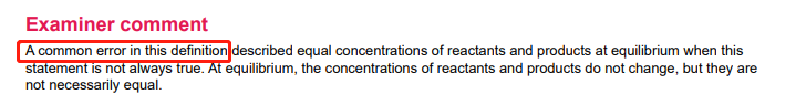 在这个定义中有个常见的错误,在平衡状态下,反应物和生成物的浓度相等,但这一说法并不总是正确。事实上,在平衡状态下,反应物和生成物的浓度不会改变,但它们不一定相等。