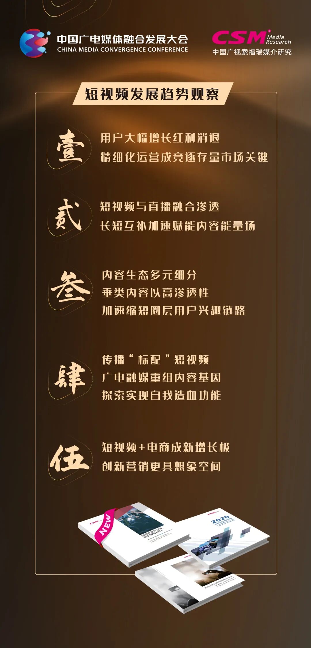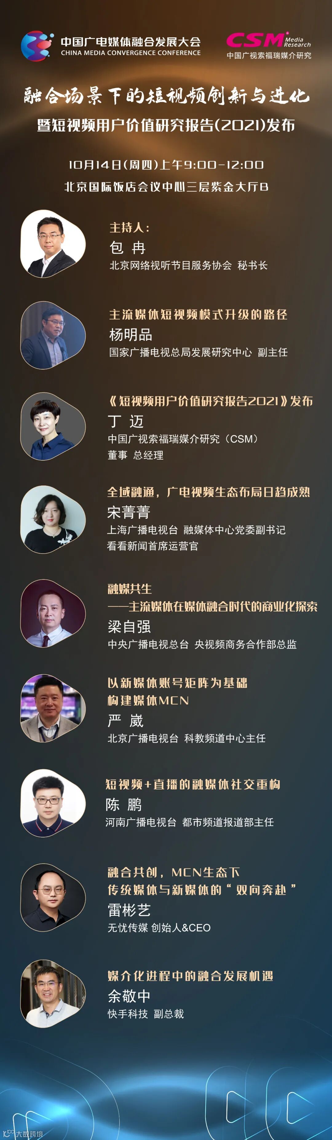 在CSM承办的“融合场景下的短视频创新与进化”分论坛上,CSM将重磅发布2021短视频用户价值研究报告。CSM连续四年开展短视频用户价值调研,从用户的使用行为、内容偏好、平台评价等维度反映短视频行业的发展现状及趋势,并重点关注广电机构融媒体传播的实践与探索,为促进短视频行业发展、最大化挖掘用户价值和媒体融合纵深推进提供数据与研究支持。
