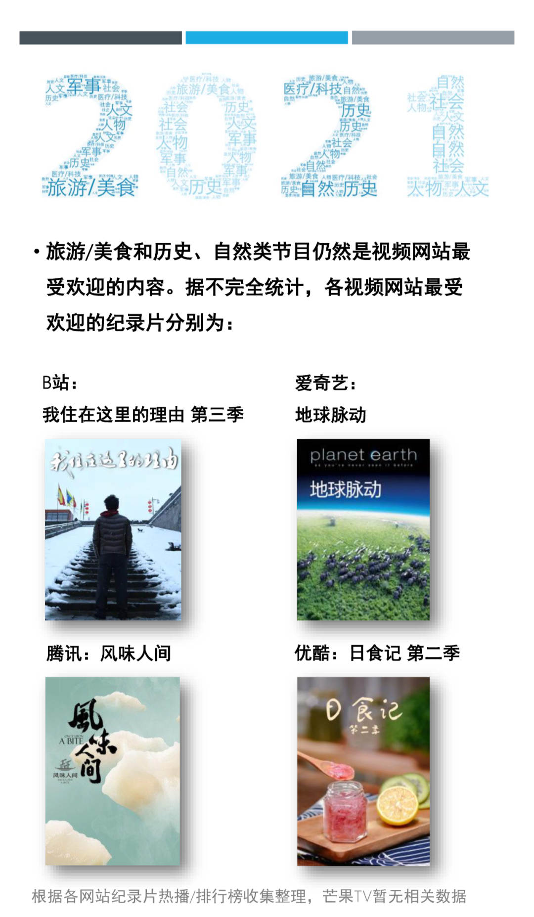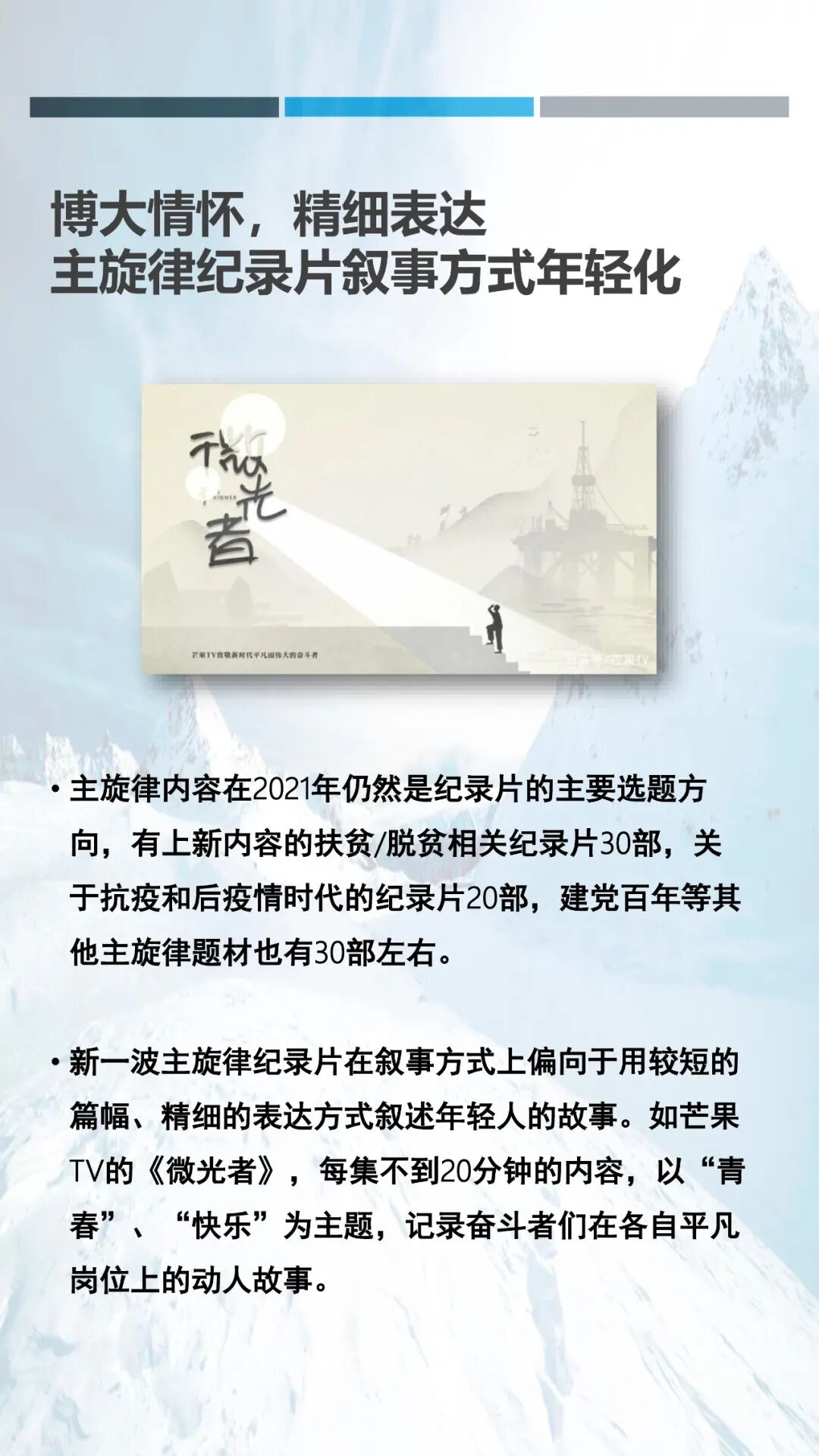 可以预见,在内外合力推动下纪录片将会迎来新的蓬勃发展,在此我们也一同回顾2021年度网络纪录片的整体市场情况和细分内容下的开拓创新。