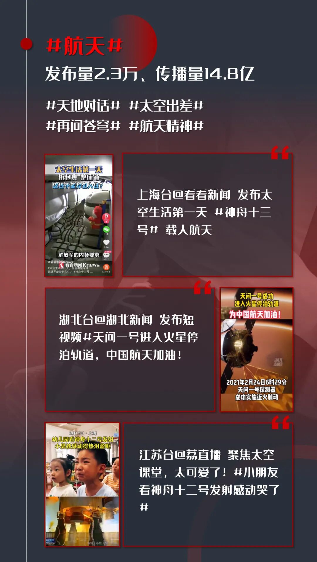 2021年是中国航天事业发展大年。“天问一号”探测器成功着陆火星,“祝融号”火星车开启巡视任务;中国空间站建设伴随着“天和”核心舱顺利入轨正式拉开序幕,“天舟系列”货运飞船、“神十二”“神十三”载人飞船顺利与空间站完成交会对接,“航天”引发了民族自豪感的“同屏共振”。