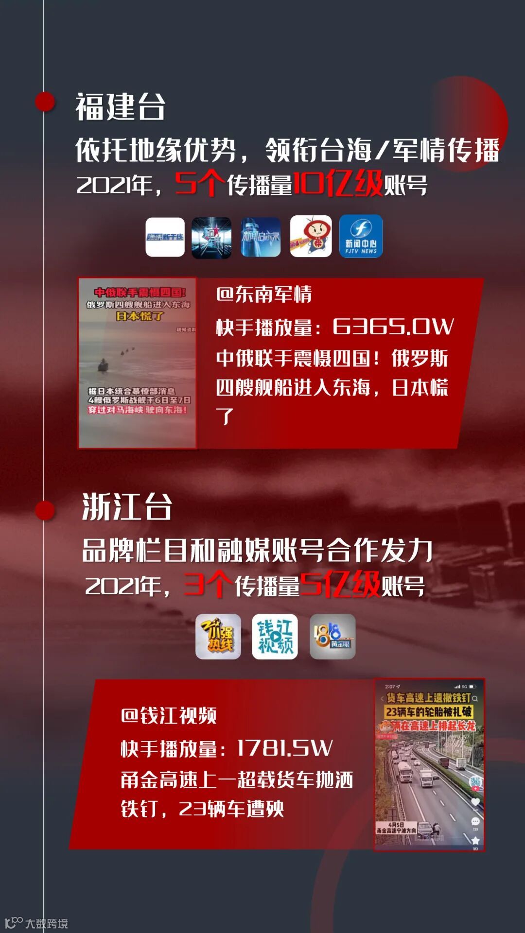 福建台依托地缘优势,领衔台海/军情短视频传播。@海峡新干线、@东南军情依托大屏节目资源,在台海/军情新闻短视频的生产及传播方面独树一帜;同时,@新闻启示录、@福建新闻联播全年传播量较2020年提升显著。