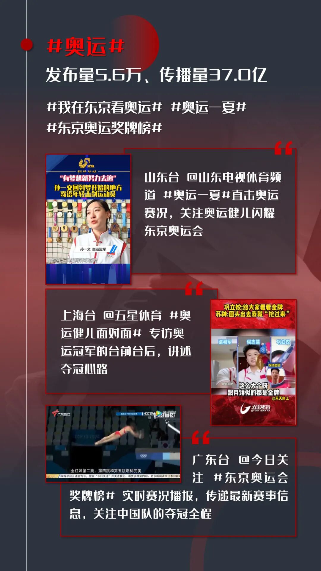 2021年7月,东京奥运会开幕,中国拿下88块奖牌、38枚金牌。射击运动员杨倩淡定拿下中国首金,管晨辰顶住压力获得平衡木冠军,14岁的全红婵以三跳满分横空出世,苏炳添成为首个跑进奥运百米决赛的黄种人……奥运健儿在赛场的拼搏精神,展现强大奋进的中国力量。