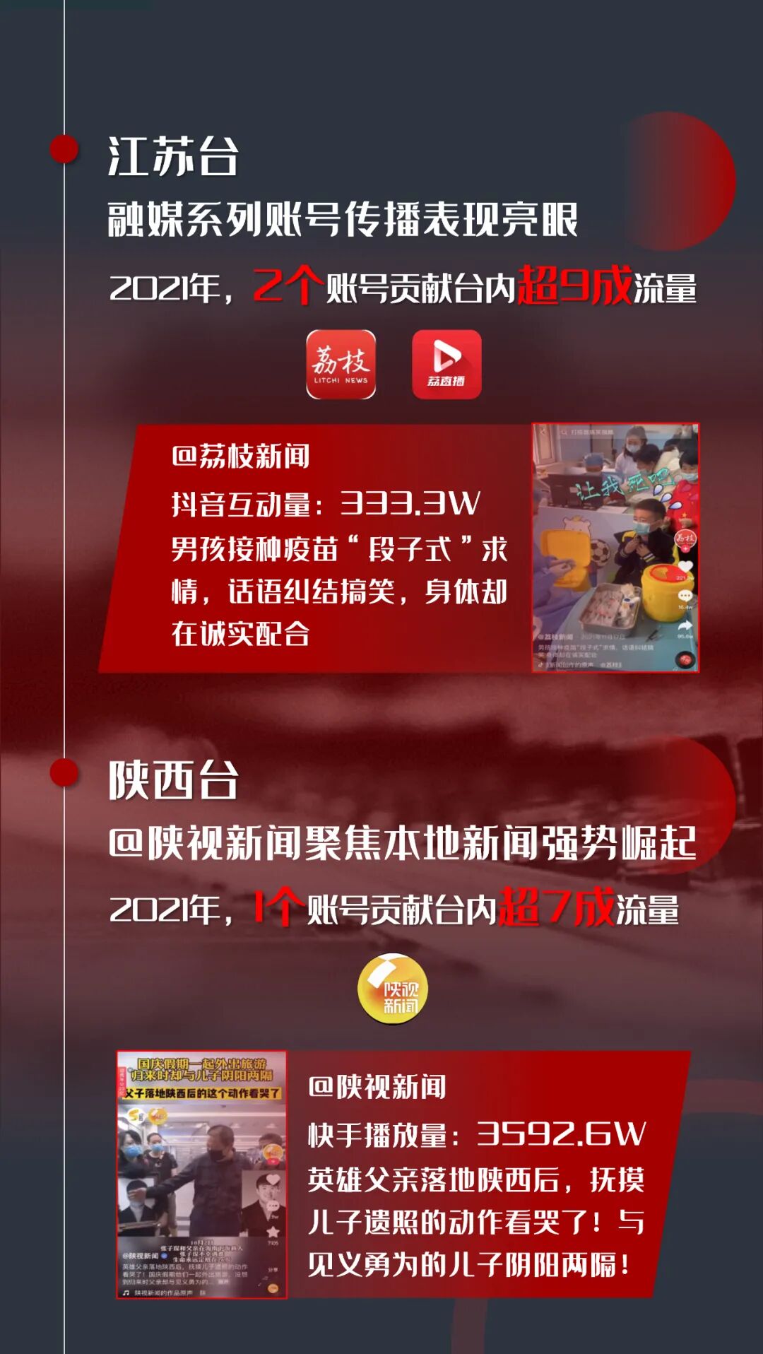 江苏台则是在融媒系列账号的带动下,@荔枝新闻、@荔直播贡献台内超九成新闻短视频传播量。