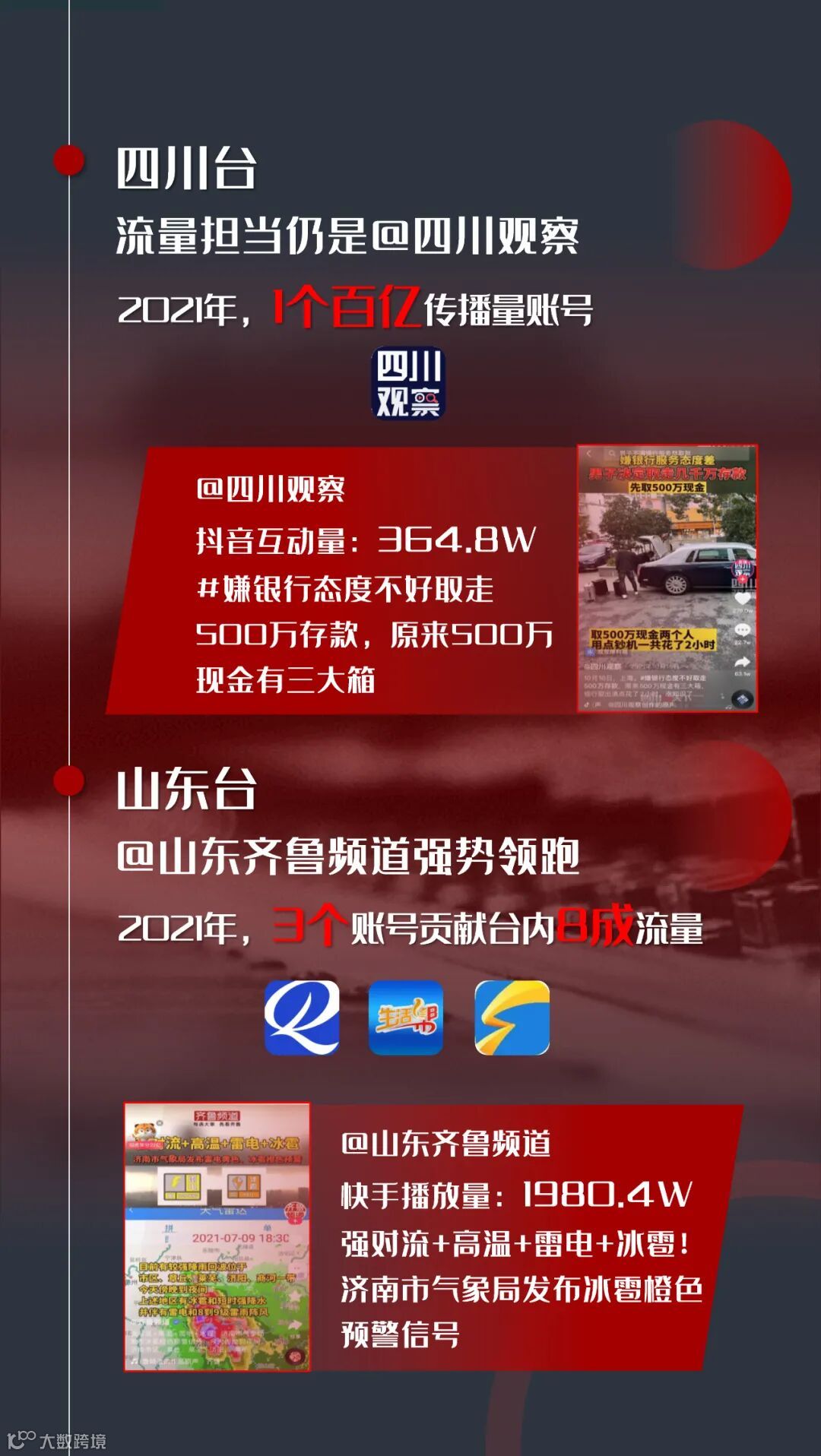 四川台的流量担当仍是融媒品牌账号@四川观察,全年发布量6.3万条,播放量、互动量均列省级台短视频账号之首。