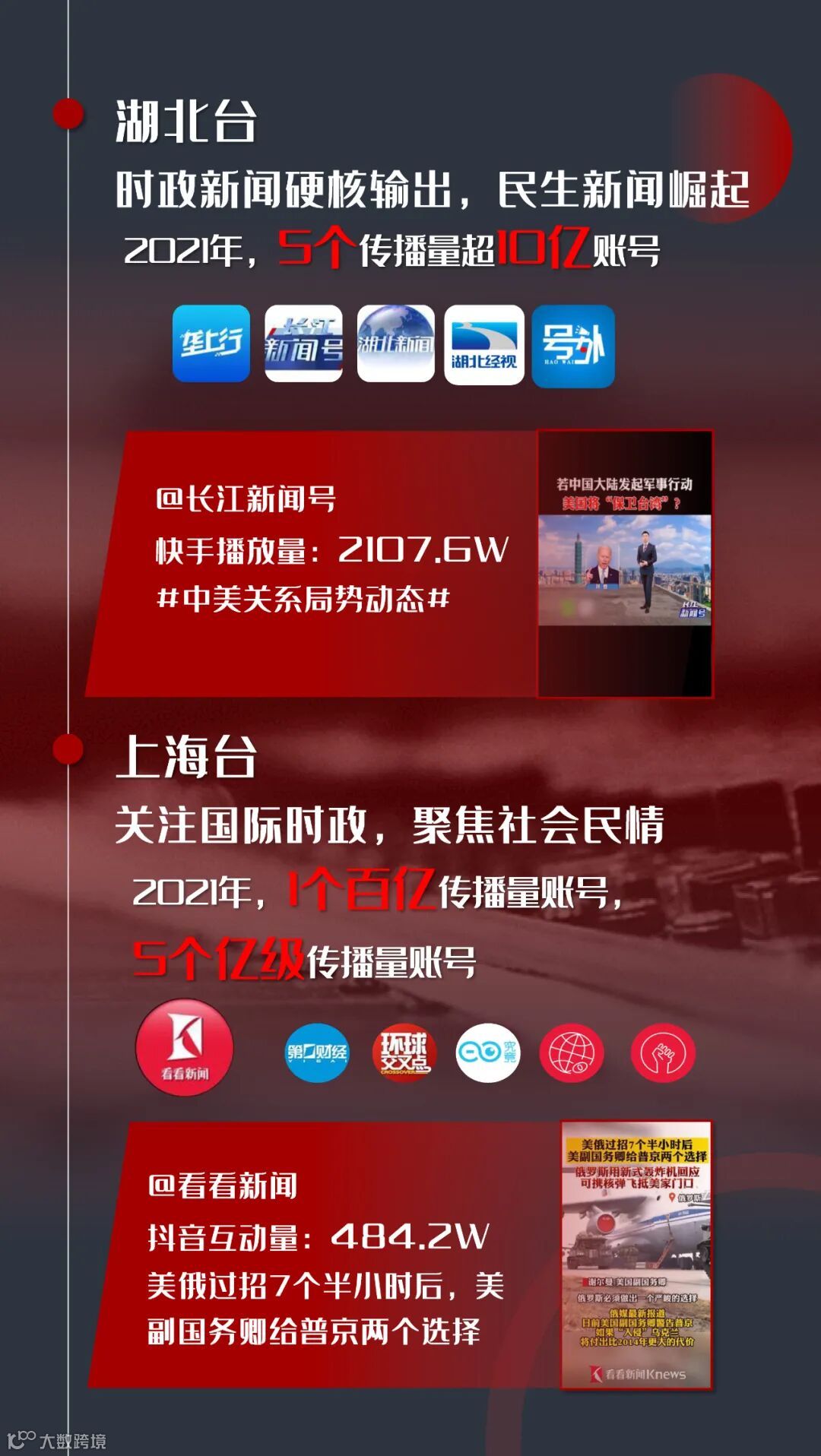 上海台融媒品牌账号@看看新闻Knews全年发布短视频超61万条、居省级台账号发布量首位,收获传播量破百亿;同时,上海台在财经和国际时政领域的短视频传播优势突出,@究竟视频、@第一财经、@环球交叉点、@全球眼News等账号贡献多条财经、国际新闻相关的高流量短视频。