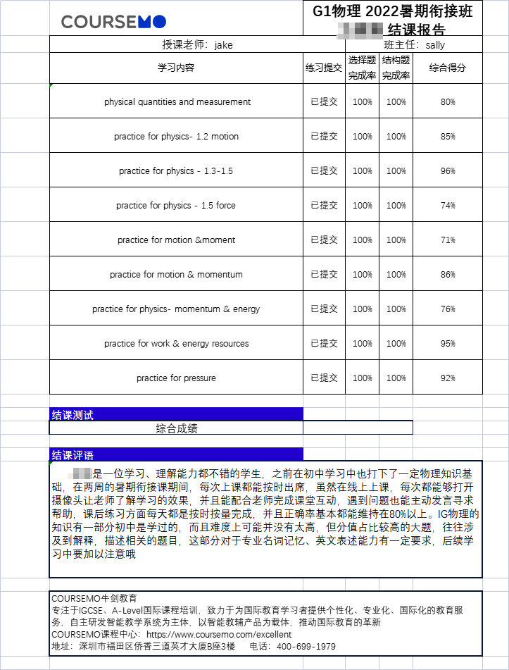 结课时学生们会统一进行结课测试,老师们也会为每一位学员撰写结课报告。