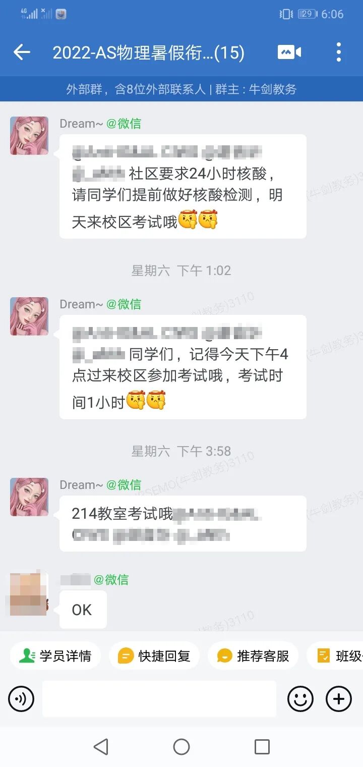 在学生的学习过程中,除了老师的循循善诱,处处都有班主任的身影。开课前的上课提醒与准备,课程进行中的互动,作业的督促,各方各面班主任都全程服务,促进学生更快适应学习状态,学习地更好!