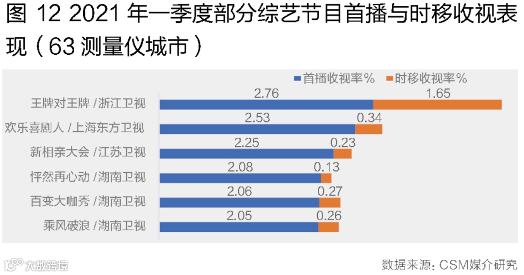 从综艺节目收视表现来看,头部综艺的大屏点播回看与直播收视呈现出齐头并进之势。2021年一季度,在63个测量仪城市中上星频道综艺节目总时移收视量与直播收视量的比例为8.3%,其中头部频道中,浙江卫视该比例为14.4%,湖南卫视为12.9%。从具体节目来看,浙江卫视《王牌对王牌6》首播收视率为2.76%,7天时移收视率为1.65%,时移收视率与直播收视率的比例最高,达59.9%,《欢乐喜剧人7》《新相亲大会5》《百变大咖秀2021》《乘风破浪》等该比例也超10%(图12)。