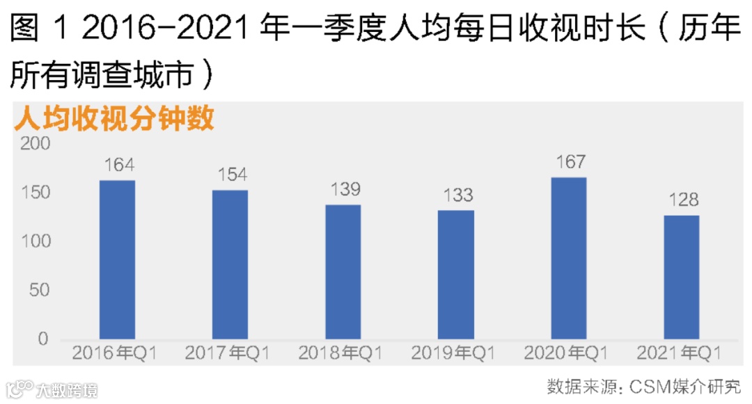 2021年第一季度,在以103个城市推及的全国电视收视市场中,平均每人每天收看电视128分钟,仍保持在两个小时以上。对比近几年数据,除2020年受疫情影响人均收视总量出现增长外,2021年一季度人均收视时长较2019年同期减少了5分钟,降幅为3.8%,与前几年相比,降幅有所减缓。由此可见,2021年一季度的后疫情时代收视总量已基本恢复常态(图1、图2)。