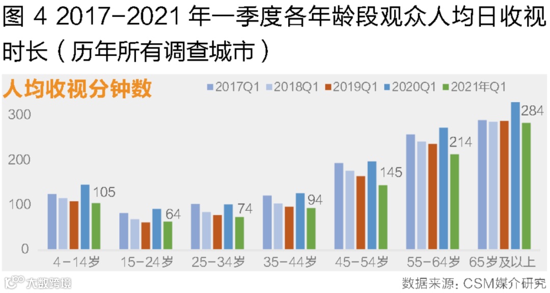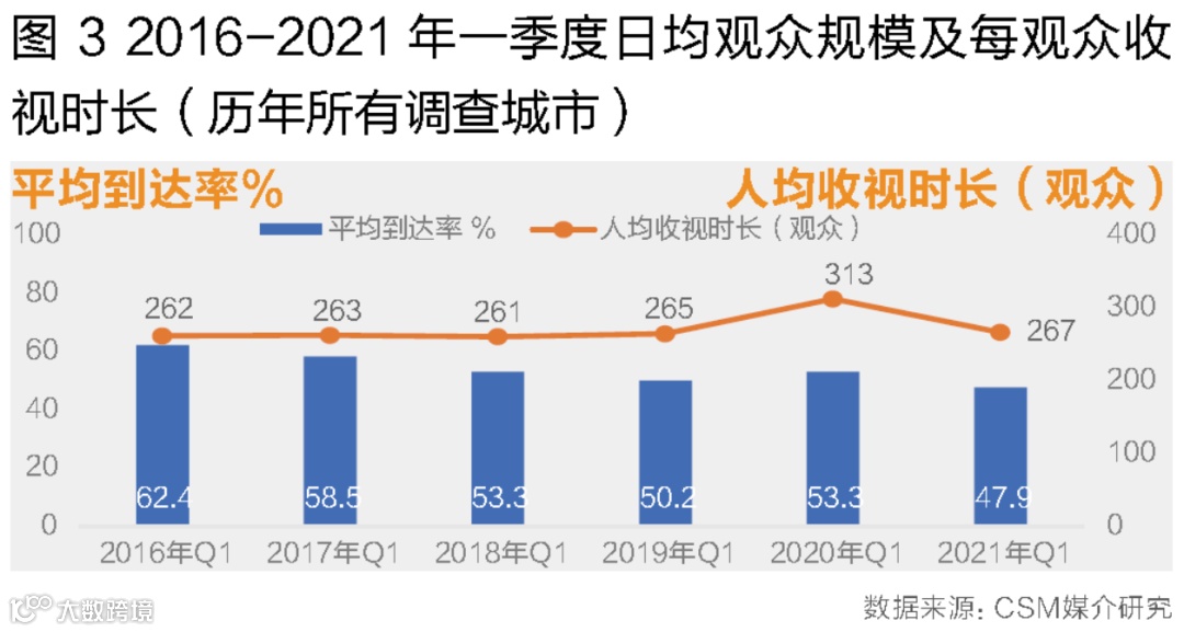 从观众规模和收视深度两个维度观察近年来一季度收视总量的变化,可以发现2021年一季度人均收视总量的减少主要源于日均观众规模的减少。2021年一季度平均每天只有47.9%的观众收看电视,对比2016-2020年同期,日均观众规模首次跌破50%。与此同时,2021年一季度实际收看电视的观众平均每人每天收看电视267分钟,近4个半小时,这与2016-2019年同期保持稳定,甚至还有小幅增长(图3)。