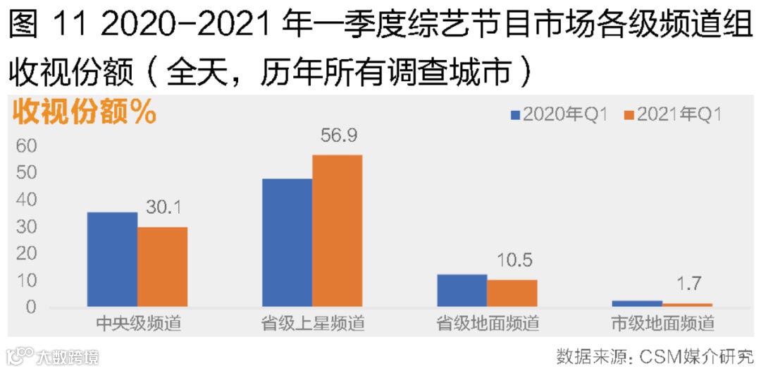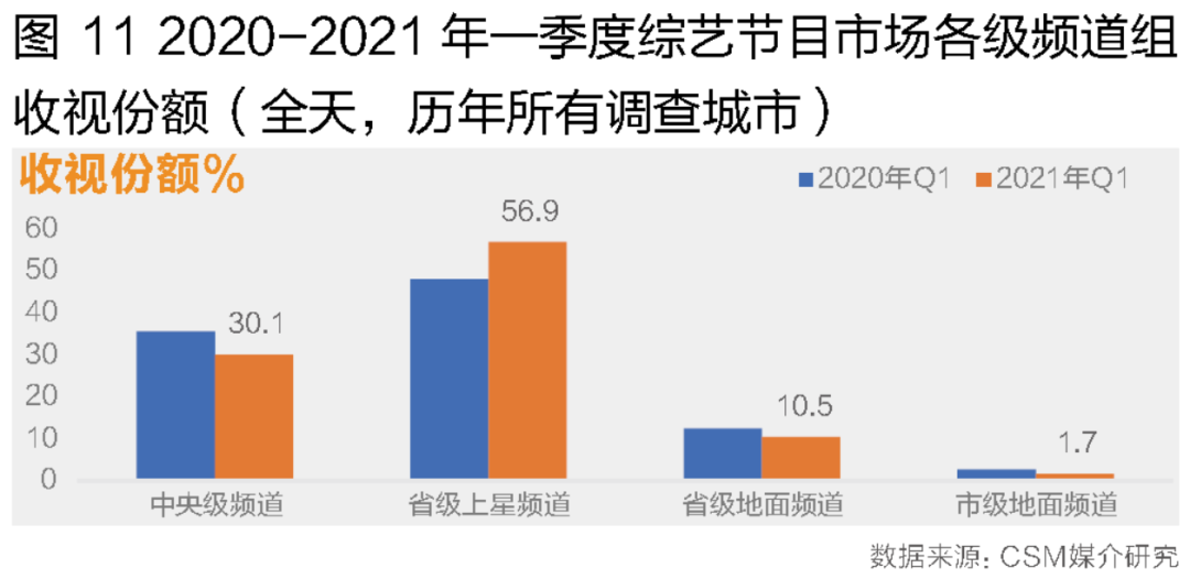 后疫情时代,综艺节目逐渐恢复正常的录制与播出,吸引综艺爱好观众重新回归大屏。2021年一季度,综艺节目的播出比重较去年同期基本保持一致,而收视比重却大幅增加,增幅高达37.4%。从各个频道组收视份额来看,超八成的收视贡献来自上星频道;其中,中央级频道组综艺节目收视份额同比下降,减少了5.5个百分点,而省级上星频道的收视份额提升显著,由2020年一季度的48.1%增长至56.9%,占据了市场的绝对优势地位;地面频道综艺节目收视份额则有小幅减少(图11)。