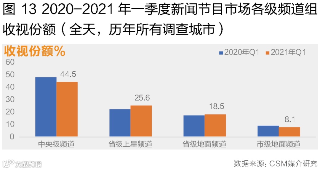 后疫情时代,新闻节目播出与收视比重同比均出现下滑,收视比重由2020年一季度的18.2%减少至14.3%。观察新闻节目在各个频道组的收视表现,2021年一季度新闻/时事类节目仍由中央级频道主导,收视占比达44.5%,同比减少3.9个百分点;省级上星频道与省级地面频道组新闻节目收视份额同比上升,省级频道收视贡献几乎与中央级频道组持平;城市台新闻/时事节目的收视份额同比下滑,收视份额不足10%(图13)。