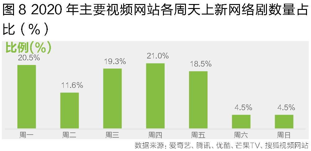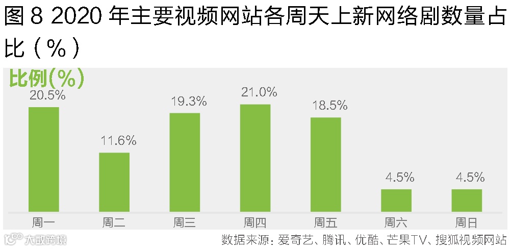 移动互联网的蓬勃发展,使得网络追剧摆脱了空间和时间上的限制,因此视频网站在新剧的编排上更注重匹配人们的生活节奏。年轻人是网络剧的主体受众,他们在周末的休闲活动相对丰富,此外,周末也是电视媒体各档综艺节目拼抢收视的红海时刻,这些都会对观众的网上追剧产生一定影响。因此,各家视频网站为了剧目能够获得更好的播出效果,往往周末时会减少上新数量。一周中周四、周一的上新数量领先,均超过20%,周三和周五的上新数量紧随其后(图8)。