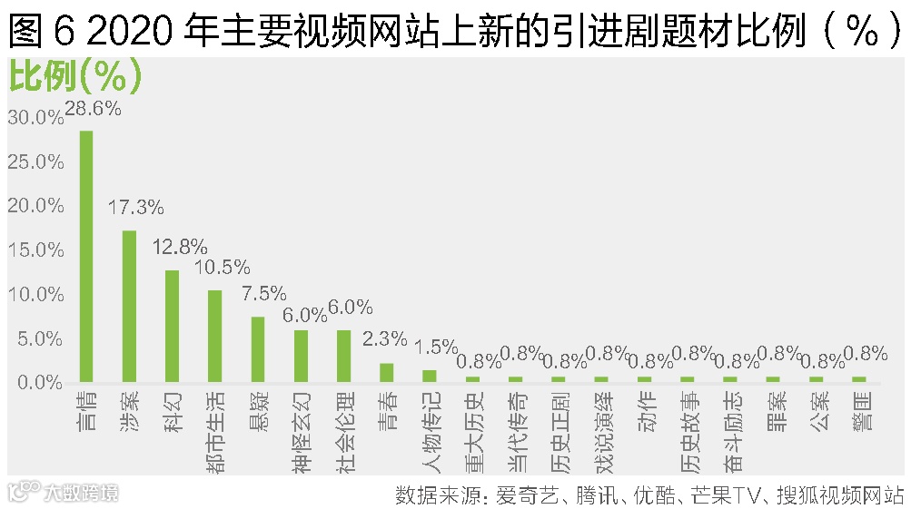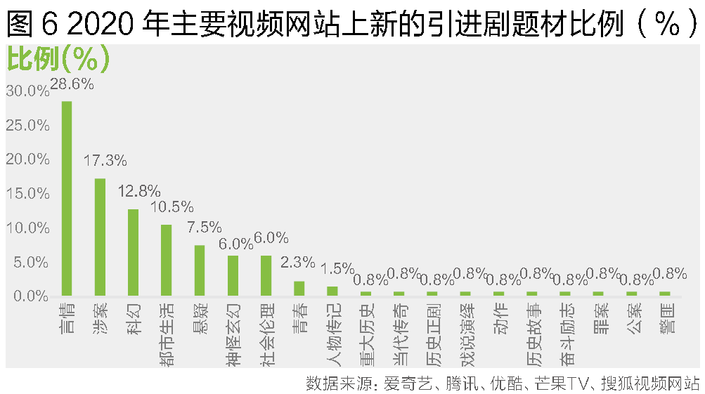言情题材是2020年主要视频网站上新引进剧的主力,凭借28.6%比例大幅领先于其他题材,但与2019年(29.5%)相比微降。涉案、科幻、都市生活题材的上新比例分布在10%-18%之间,也属于相对热门的题材,且较上年有着不同程度的增长(2019年:涉案13.2%、科幻9.3%、都市生活9.3%)。悬疑、神怪玄幻、社会伦理题材的剧目占比均在6%以上,其余类型题材所占份额较小,但对满足受众的多元化需求形成了有益补充(图6)。上新的引进剧中,主要以当代题材为主,其占比达到88%,较2019年增加了2.7个百分点。生活在同一时代中的人们,虽然生活和文化背景不同,但却易于相互理解,这也是引进剧中当代题材风行的原因之一。