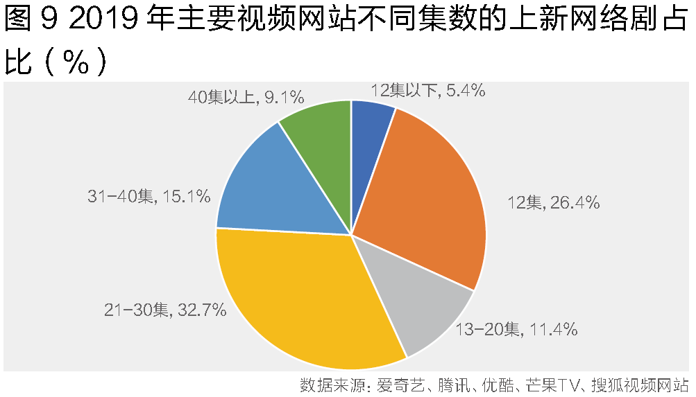 视频网站的上新网络剧中,篇幅在12集及以下的小体量剧目占比31.8%,13-30集的轻体量剧目占比44.1%,31-40集的中体量剧占比15.1%,40集以上的长剧集占比9.1%(图9)。不同篇幅的剧目有着各自的优势,小体量、轻体量的剧目由于制作周期短、制作成本相对较低,可以满足视频网站剧目采购数量大、播出速度快的需求,而且每天都有几部播出或在更的情况下,对于视频网站引入流量非常有效。中、长篇幅的剧目,由于集数较多,播出的持续时长也相对较长,对于稳固用户数量、稳定流量来说,则有着较突出的贡献。因此视频网站在不同篇幅剧目的选择上,普遍采取以“短”扩量、以“长”维稳的策略。