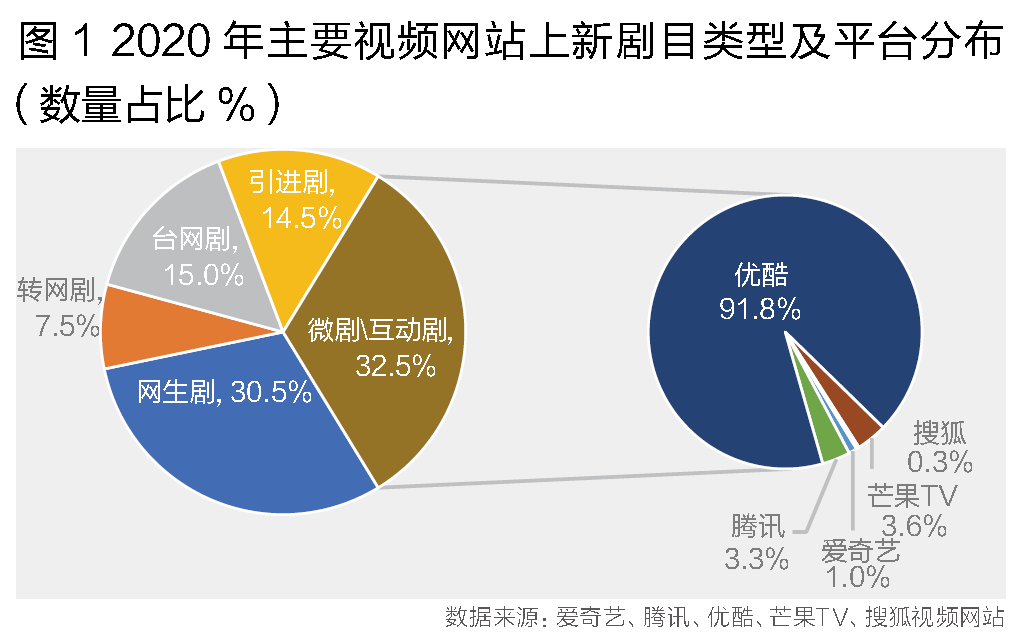 微剧\互动剧之外,上新网生剧的占比为30.5%,仍是视频网站吸引用户的主力军。台网剧[4]和引进剧[5]的份额接近,前者略胜一筹,转网剧[6]的占比则相对较小。与2019年上新网生剧的数量相比,2020年增幅高达41.7%,转网剧数量增长11.1%,引进剧数量增长3.1%,台网剧稳中略降,降幅为1.4%。网生剧、转网剧、引进剧,或者首播始于网络、或者仅网络播出,这三类剧目的合计增幅超过55%,由此也可以看到视频网站希望占据“内容”优势的竞争策略(图1)。