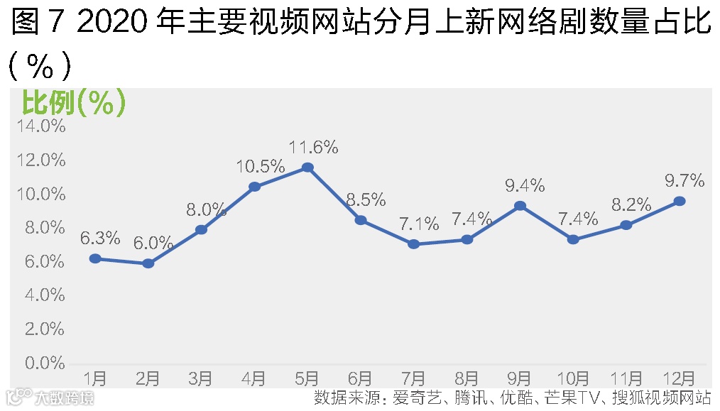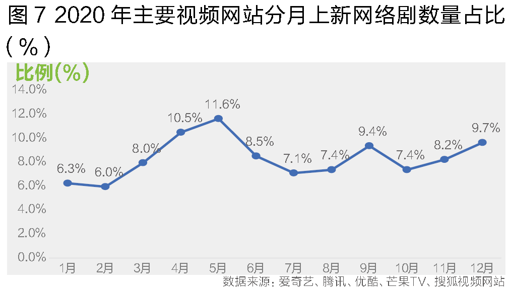 从2020年各月上新网络剧的数量比例来看,寒假、暑假这些追剧的旺季,剧目上新力度反而力有不逮。从1、2月寒假来看,上新的网络剧数量比例分别为6.3%和6%,在全年中最低,这与春节和其后的疫情影响不无关系。3月份后,企事业单位的复工全面开启,视频网站的工作同样也步入正常轨道,而广大的学生族群仍多为居家状态,因此视频网站适时加大上新力度,以满足旺盛的收看需求。5月后随着疫情缓解以及复工复课的有序推进,居家人口数量渐次减少,网络剧上新数量回落。7月、8月暑期的到来,剧目上新力度再次出现下降,反而在9月份开学季迎来增长(图7)。视频网站的网络剧上新整体呈现出开学复工季“淡季不淡”,寒暑假“旺季不旺”的特点,但也在一定程度上受疫情发展及防控的影响。