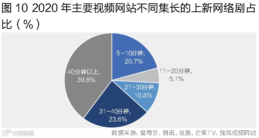单集时长超过30分钟的剧目占据着主导地位,在上新网络剧中共计占比达到63.4%。视频网站在“短剧”的赛道上也并未放弃,单集时长在5-10分钟的剧目占比为20.7%,它较前面所提及的“微剧”从时长、故事性、观赏性上都有升级。单集时长11-30分钟的剧目上新数量并不出彩,共占15.9%,其中单集时长21-30分钟的剧目比例略高(图10)。“短剧”在视频网站的播放效果,与“长剧”相比仍然有着较大的差距,“短剧”由于篇幅所限,故事的呈现上欠缺饱满度和曲折性。此外,就目前而言主要视频网站更善于在“长视频”内容上展开竞争,“短视频”类内容虽然有所布局,但未来发展仍有着较大的上升空间。