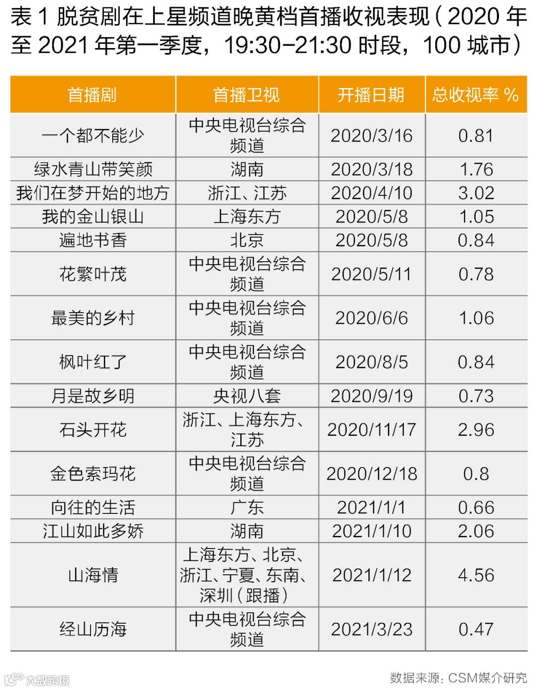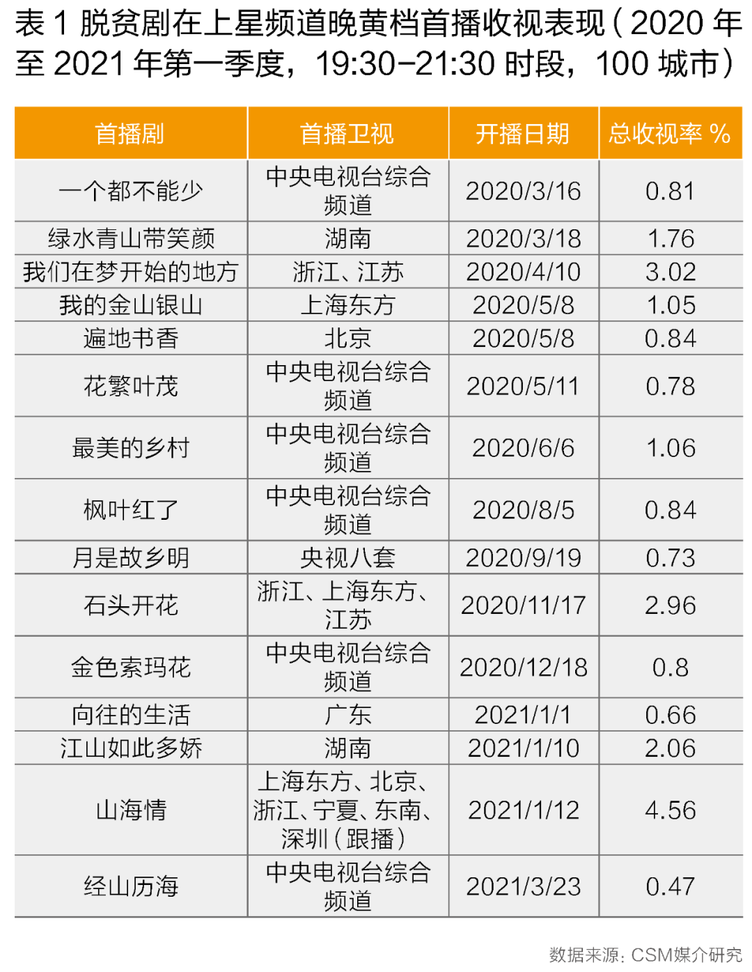 脱贫剧成为2020年以来的一大黑马题材,围绕全面建设小康社会主题,秉承“以现实为蓝本”的创作思路,多角度运用现实主义创作手法,不少故事情节和剧中人物都源自真实典型,同时大量采用年轻化的表达方式来兼顾年轻观众,扶贫模式不一而足,不少剧目题材颇有新意,基本做到了叙事差异化。一线卫视纷纷抛来橄榄枝,尤其是中央广播电视总台发挥了领航优势。截止2021年4月20日,上星频道晚黄档共首播政府推荐22部片单中的一半,央视一套独揽5部,首先推出《一个都不能少》(2020/3/16),收视最好的是《最美的乡村》,收视率破1%。湖南卫视独播剧收视较好,《绿水青山带笑颜》逼近1.8%,《江山如此多娇》突破2%;浙江和江苏卫视播出《我们在梦开始的地方》,总收视率破3%;上海东方卫视的《我的金山银山》收视率破1%;北京卫视播出《遍地书香》,收视效果一般;二线卫视中,安徽卫视推出了《日头日头照着我》(表1)。
