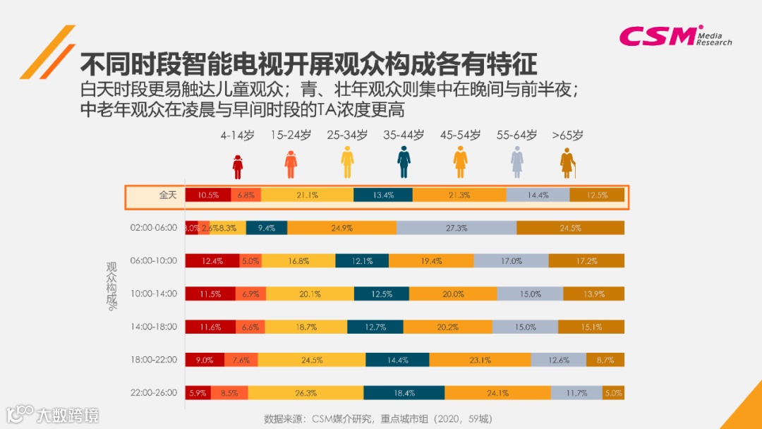 从分时数据观察,不同时段的智能电视开屏触达差异显著,智能电视开屏全天从02:00至22:00整体呈持续上升趋势,并在18:00-22:00时段达到峰值。白天时段更易触达儿童观众,青、壮年观众则集中在晚间与前半夜,中老年观众在凌晨与早间时段的TA浓度更高。