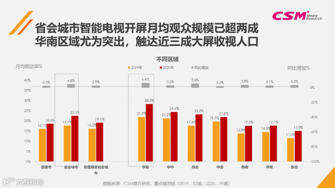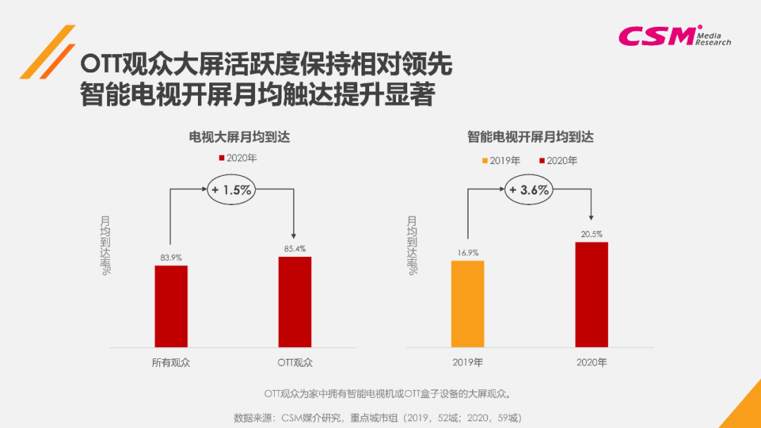 纵观2020全年,OTT观众在月均到达率上保持相对优势,稍领先于电视大屏所有观众,而OTT中智能电视的开屏月均到达同比增长更为明显,为OTT受众的高触达贡献了重要力量。研究发现,省会城市在智能电视开屏月均观众规模上率先超过两成,直辖市、省会城市、以及非省会的低线城市在智能电视开屏月均到达上也表现出竞相追逐和同比稳定增长的态势。