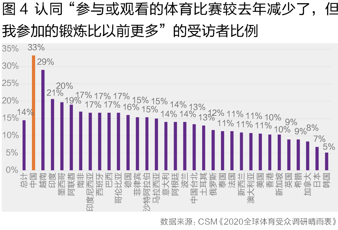 疫情也提高了人们对亲自参与体育运动的热情。疫情初期,“宅家抗疫”掀起了第一波居家健身的热潮。随着疫情的发展,人们更是深刻认识到了好身体的重要性,“全民健身”真正成为了国民共识。调查数据显示,33%的中国体育受众表示“参与或观看的体育比赛较去年减少了,但参加的锻炼比以前更多”,这一比例远高于全球的平均值14%(图4)。丁香医生数据研究院发布的《2021国民健康洞察报告》中提到,“2020年大家开始更加注重通过运动锻炼来缓解自己的心里困扰,这种应对方式由2019年的第五位上升至了今年的第二位”。体育运动成为身心保健的一大利器,中国体育受众对体育从“观赏”向“参与”转变。