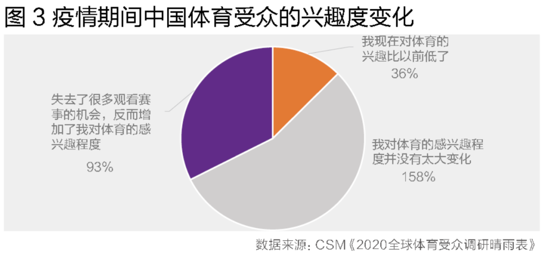 尽管疫情严重影响了体育赛事的供应与收视,但我们惊喜地看到,中国体育受众对体育的兴趣并未随之消减。55%的受访者表示赛事的减少并没有影响自己对体育的感兴趣程度,反而有32%的受访者表示由于失去了很多观看赛事的机会,反而增加了其对体育的感兴趣程度(图3)。