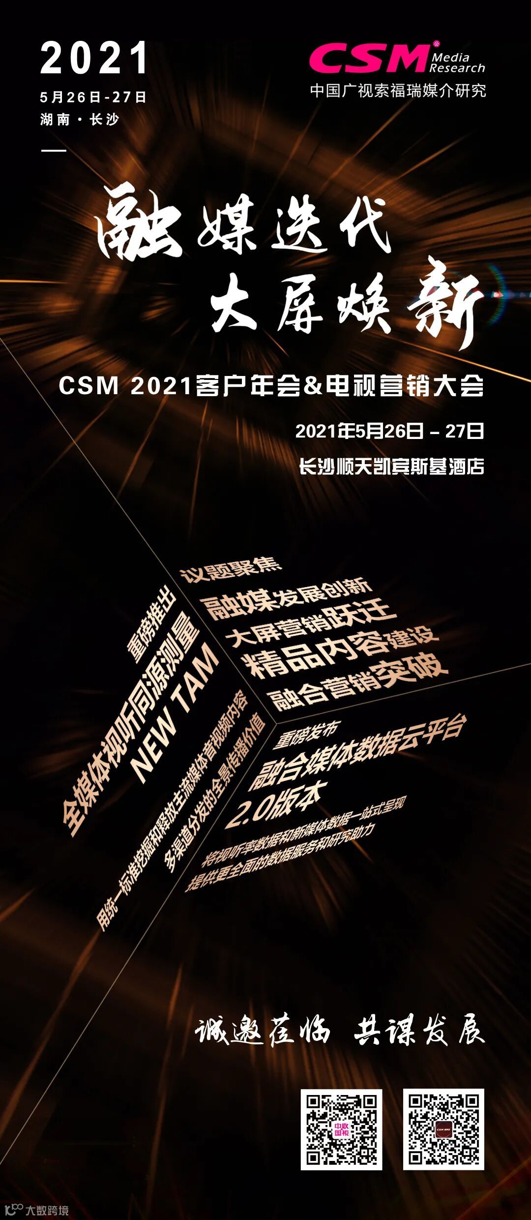 本次大会将为大家奉上一场重量级的传播盛宴。大会将邀请30余位行业大咖围绕融媒发展、大屏营销、精品内容建设、融合营销突破等热点议题展开讨论与分享,另外CSM将发布融合媒体数据云平台2.0版本,将主流媒体深度融合发展进程中所需要的视听率数据和新媒体数据一站式集中呈现,为广电媒体提供更全面的数据服务和研究助力。同时,为了在媒体融合环境下更好地服务广电媒体,CSM将重磅推出全新数据产品:全媒体视听同源测量(New TAM),用统一标准挖掘和释放主流媒体音视频内容多渠道分发的全景传播价值。