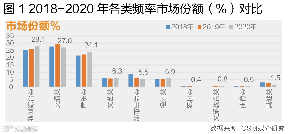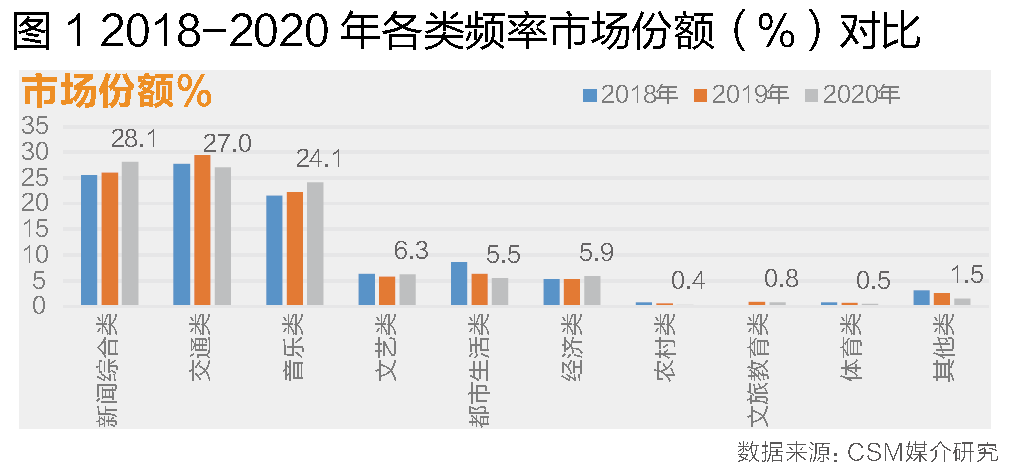 从2020年各类频率的整体竞争情况来看,新闻综合类、交通类和音乐类频率依然处于“第一梯队”,三者份额之和占整体市场总量的近八成,其中新闻综合类频率跃居第一,份额从2019年的26.0%上升至28.1%,以车载市场为主要收听场所的交通类频率受疫情影响排名跌至第二,音乐类频率位列第三,份额近三年逐年提升,2020年份额为24.1%,和前两类频率之间的差距有所缩小(图1)。