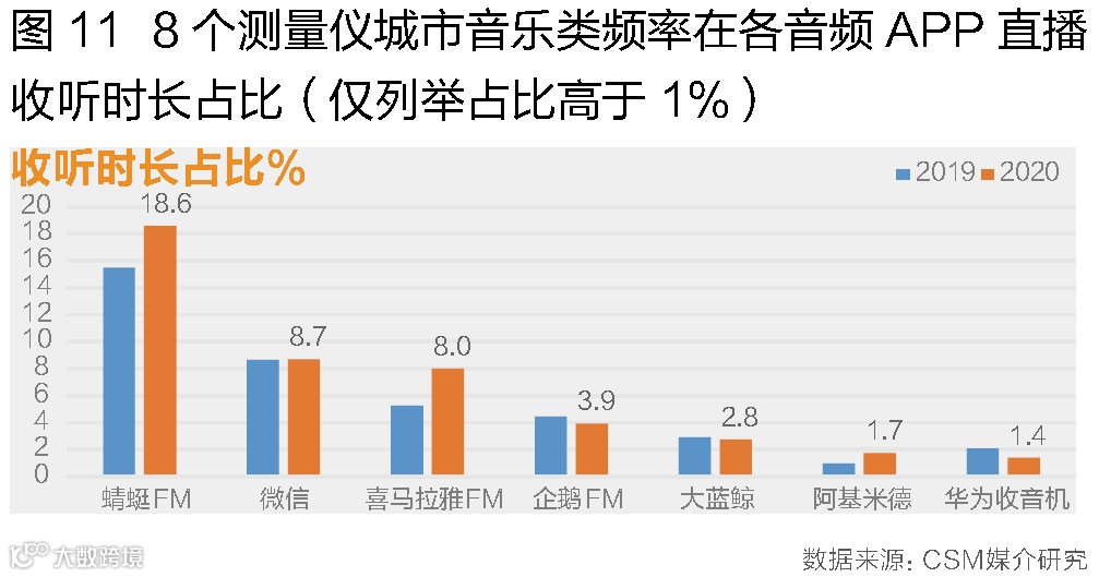 2020年,8个测量仪收听率调查城市的数据显示,通过手机端APP收听音乐类频率直播内容的听众中,对蜻蜓FM、微信和喜马拉雅FM3个APP的收听时长占比最高,分别为18.6%、8.7%和8.0%。相较2019年,这三个APP收听时长占比均有所提升,其中蜻蜓FM和喜马拉雅FM的时长占比增长较多,分别增长了3.1和2.7个百分点,阿基米德在2020年的收听时长占比也较上一年增加较多,涨幅达78%(图11)。