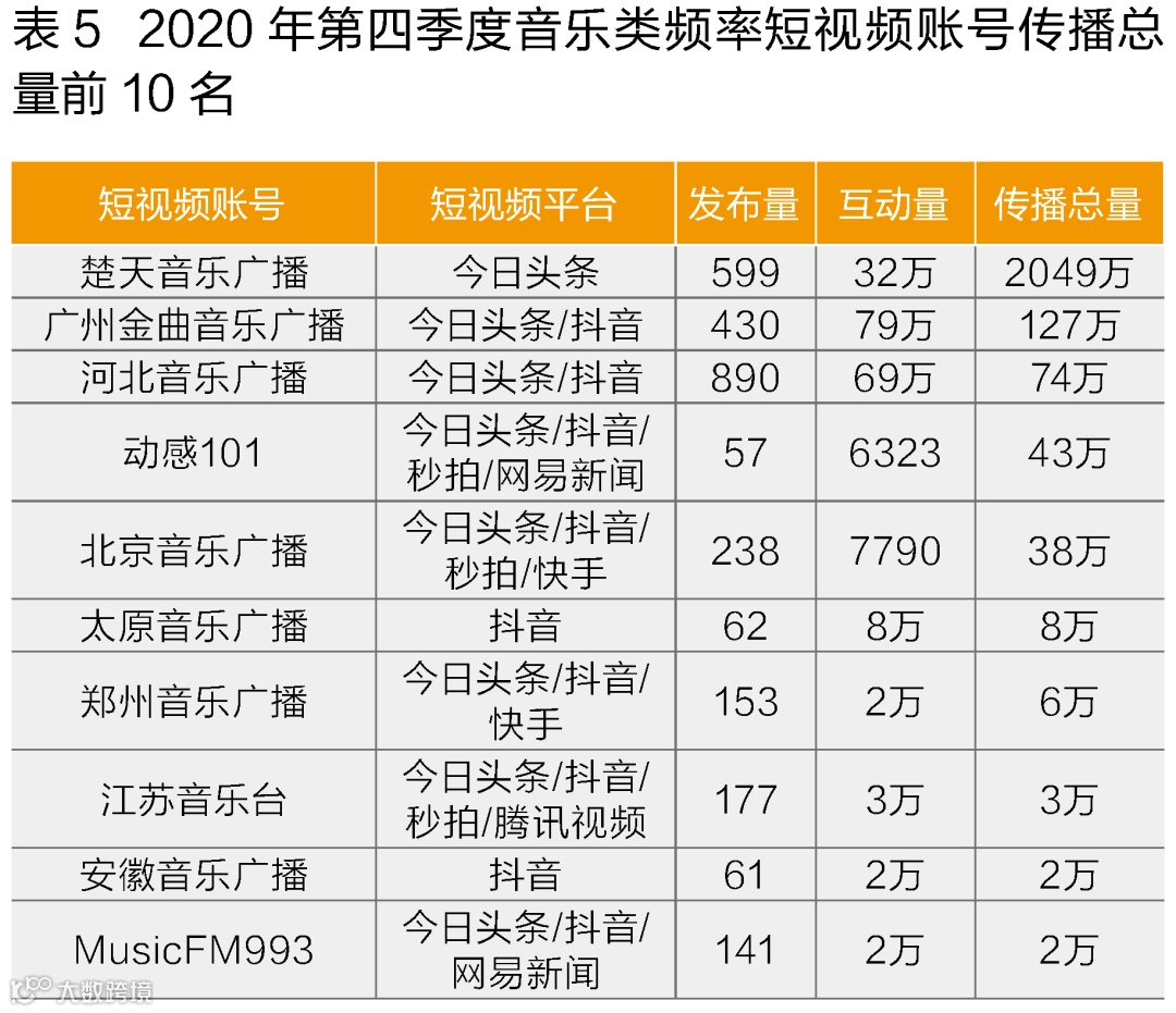 随着短视频产业政策引导规范化、行业活跃用户规模趋稳、内容生态逐步成熟,短视频产业已经告别野蛮生长,进入平稳发展期。如今人们的生活工作节奏越来越快,繁重的工作和生活压力持续压缩着人们娱乐放松的时间,短视频的兴起契合了当下大众碎片化的娱乐需求,截至2020年底,我国短视频用户规模已达8.73亿。庞大的用户群体使得各地音乐类频率开始布局短视频平台,纷纷在小屏端开拓进取以扩大频率自身的影响力。2020年第四季度各音乐类频率短视频账号中,“楚天音乐广播”在今日头条平台中收获了2049万的传播总量,独占鳌头;“广州金曲音乐广播”在今日头条和抖音平台共计收获了127万的传播总量,其中今日头条传播量为48万,抖音平台传播量达79万;动感101、北京音乐广播和江苏音乐台等频率在至少3个短视频平台都开设了频率账号,增加传播广度,以期能“以量取胜”,提高传播效果(表5)。