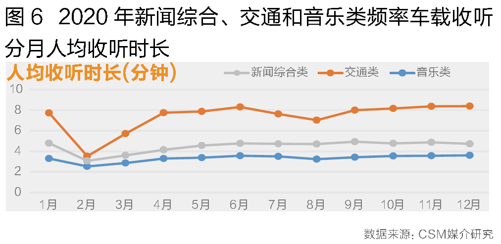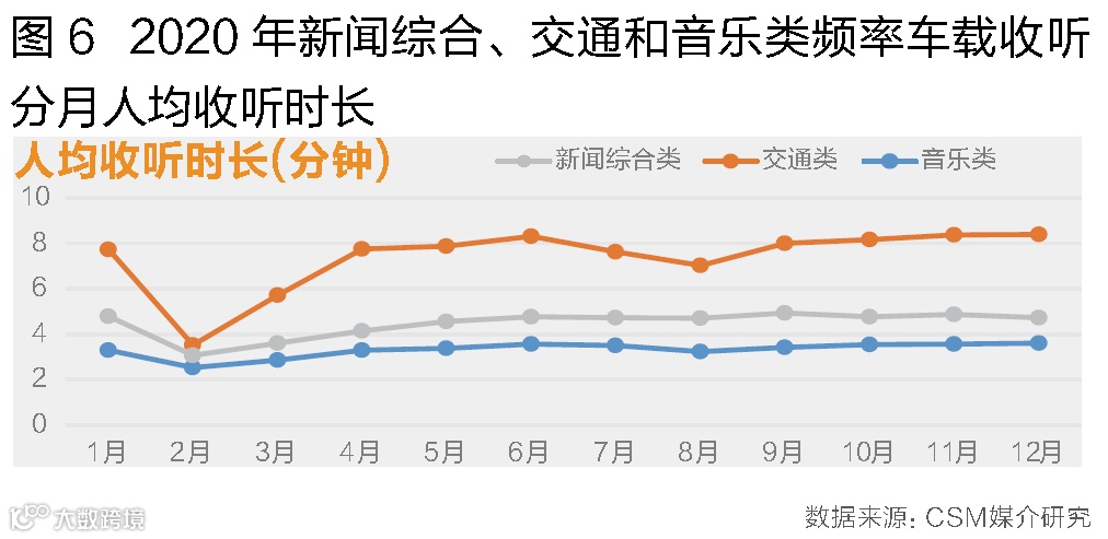 而在车载收听场所,交通类频率受到的影响最大,2月人均收听时长从1月的7.7分钟下降至3.5分钟,降幅达54.5%。音乐类频率人均收听时长则从1月的4.8分钟下降至2月的3.1分钟,降幅达35.4%。4月之后,各类频率车上收听量也逐步恢复至疫情爆发前的水平(图6)。