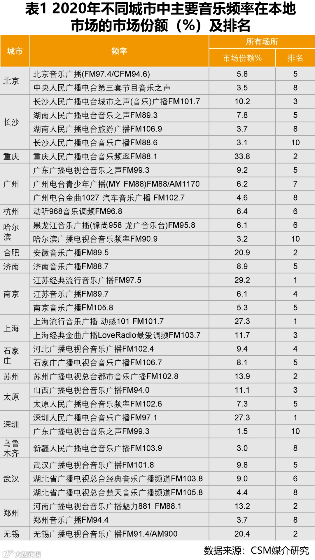 纵观全国18个城市中主要音乐类频率在本地的竞争力水平,在所有场所收听中,共有33个音乐类频率在当地市场的份额排名进入前十位。其中,重庆人民广播电台音乐频率FM88.1、安徽音乐广播FM89.5、江苏经典流行音乐广播FM97.5、上海流行音乐广播动感101 FM101.7、深圳人民广播电台音乐广播FM97.1和无锡广播电视台音乐广播FM91.4/AM900在本地市场的份额水平表现突出,单个频率份额就超过了20%。江苏经典流行音乐广播FM97.5、上海流行音乐广播动感101 FM101.7和深圳人民广播电台音乐广播FM97.1这3个频率在当地市场所有频率份额排名中位居第一(表1)。