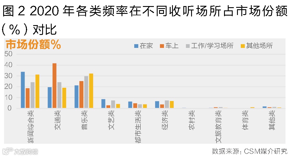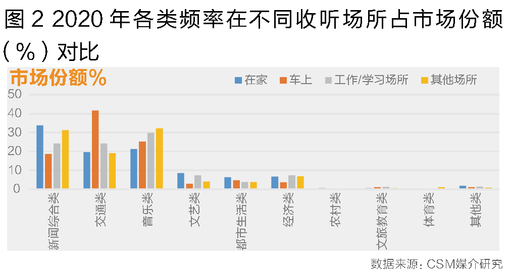 不同类型的广播频率由于其节目内容、收听群体的差异,在不同收听场所的竞争力也不尽相同。新闻类频率以33.8%的份额领跑家中收听;车载场所中则是交通类频率以超过四成的市场份额一枝独秀;音乐类频率在各个场所的收听表现较为平均,居家和车载收听份额均位列第二,而在工作/学习场所则是听众们的首选频率。另外,由于近些年来智能手机的普及以及众多音频APP的出现,“其他场所”成为了各类频率收听量新的增长点,2020年音乐类频率在“其他场所”中市场份额位居第一(图2)。