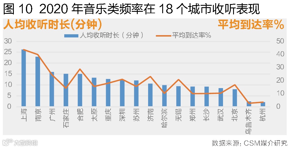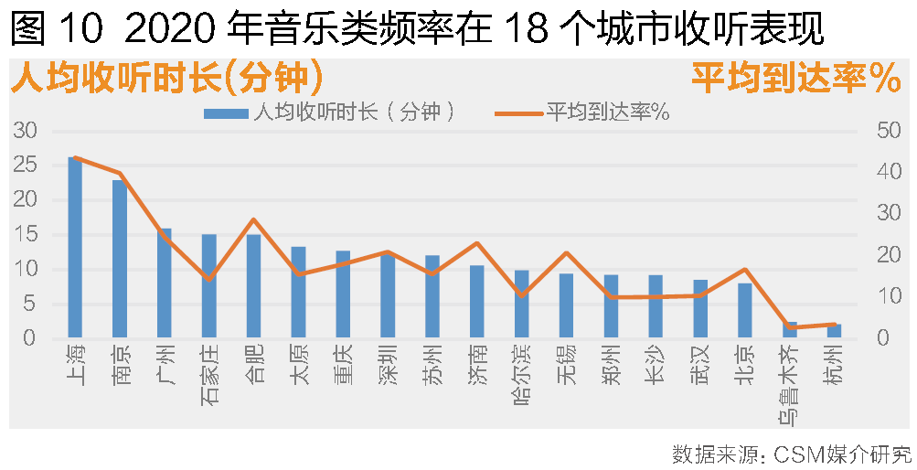 综合两个指标来看,音乐类频率在上海、南京、广州和合肥的收听表现较为出色,到达率和收听量水平均较高,发展均衡;而乌鲁木齐和杭州等城市的音乐频率收听表现尚有待提升(图10)。