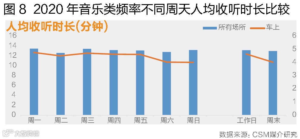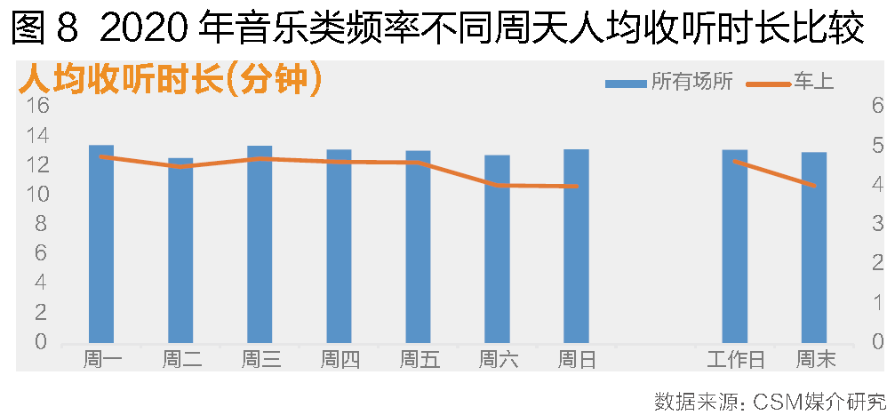 从音乐类频率不同周天的收听时长对比来看,所有场所中不同周天之间或工作日和周末之间的差别较小,各天收听量保持稳定,人均收听时长基本在13分钟左右。而在车载收听场所中,由于大部分听众周末与工作日的作息不同,收听量差异相对明显,周六周日两天较周一至周五的平均收听量有0.6分钟的减少(图8)。