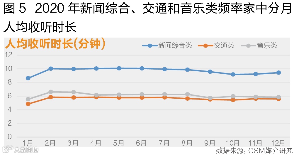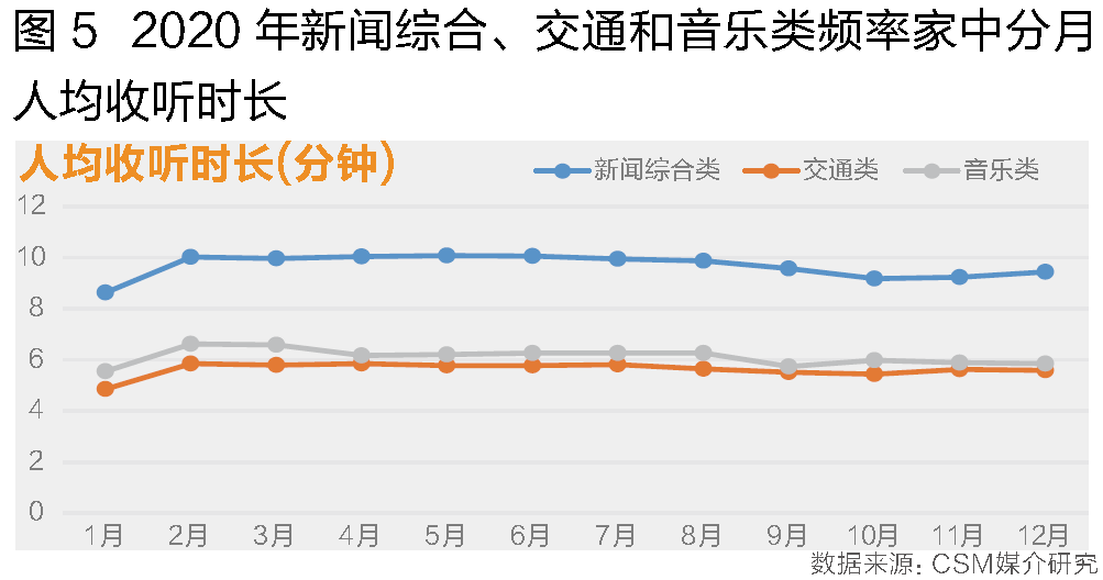2020年受疫情影响,人们的居家时间增多,新闻综合、交通和音乐频率的家中人均收听时长均在2月有明显增长。其中,新闻类频率的收听量增长最多,达1.4分钟。音乐类频率2月的收听量较上月增加1.1分钟,涨幅19%。随着疫情逐渐得到有效控制,人们陆续复产复工,家中收听量也随之稳中有降(图5)。