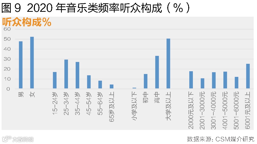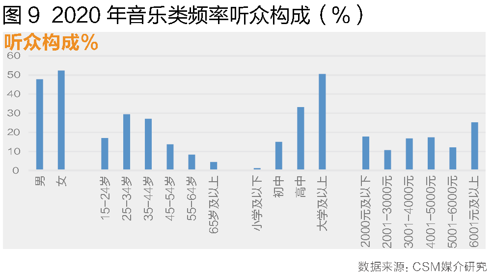 ▎音乐类频率听众以女性、年轻、高知和高收入人群为主