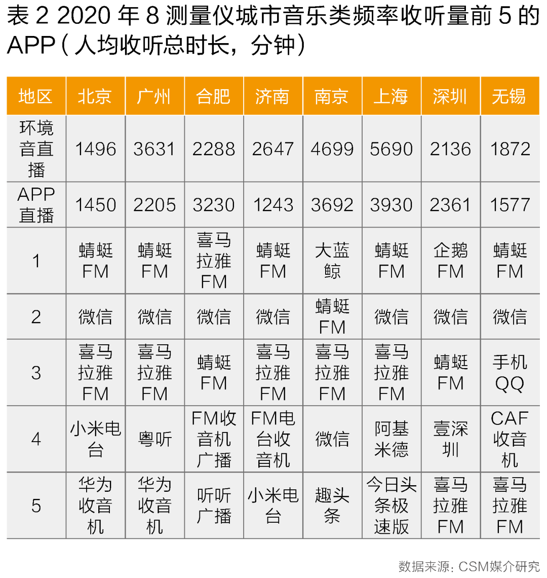 随着智能手机的广泛普及,“听广播”已经不再局限于使用家中的收音机收听,通过各种各样的App来收听广播逐渐成为主流渠道。2020年,在8个测量仪城市中,音乐类频率在移动App端收听效果较好。合肥和深圳地区音乐类频率在移动端App的收听时长已经超过了环境音收听,北京、无锡两地两者收听水平相近,其他地区移动端App收听时长的占比也逐步提升。从各类移动端收听App来看,蜻蜓FM、微信和喜马拉雅FM是听众使用收听最多的三款App软件,均进入了8个测量仪城市的收听总时长App前五名。除此以外,广电媒体旗下的音频App也将重心更多地放到了本地市场,多个广电媒体App在本地移动收听市场的影响力已经举足轻重。如江苏广电旗下的大蓝鲸在南京地区App直播中的收听总量排名第一,上海SMG旗下的阿基米德在上海、广东广电旗下的粤听在广州、深圳广电旗下的壹深圳在深圳地区App直播中的收听总量均排名第四(表2)。