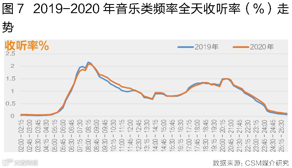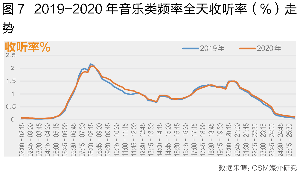比较近两年音乐类频率的全天收听率走势可以看到,音乐类频率收听走势整体保持稳定,早晚高峰峰值均出现在早间7:00-9:00和晚间19:45-21:30时段,2020年早高峰时段收听率较2019年略有下降,早高峰峰值由2019年的2.2%略降为2020年的2.1%,晚高峰峰值为1.5%,与上一年持平,上午9:30-12:00时段收听率较上一年有较明显提升(图7)。