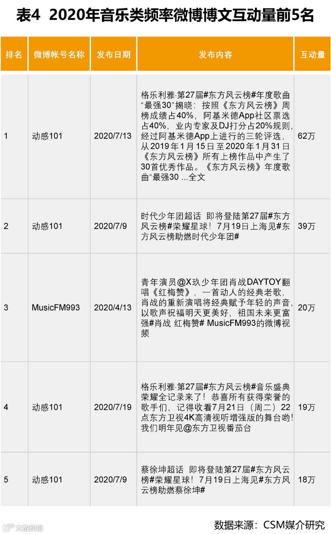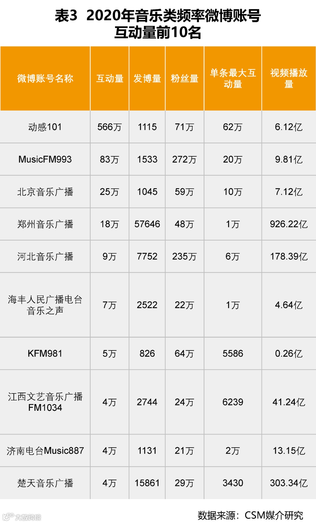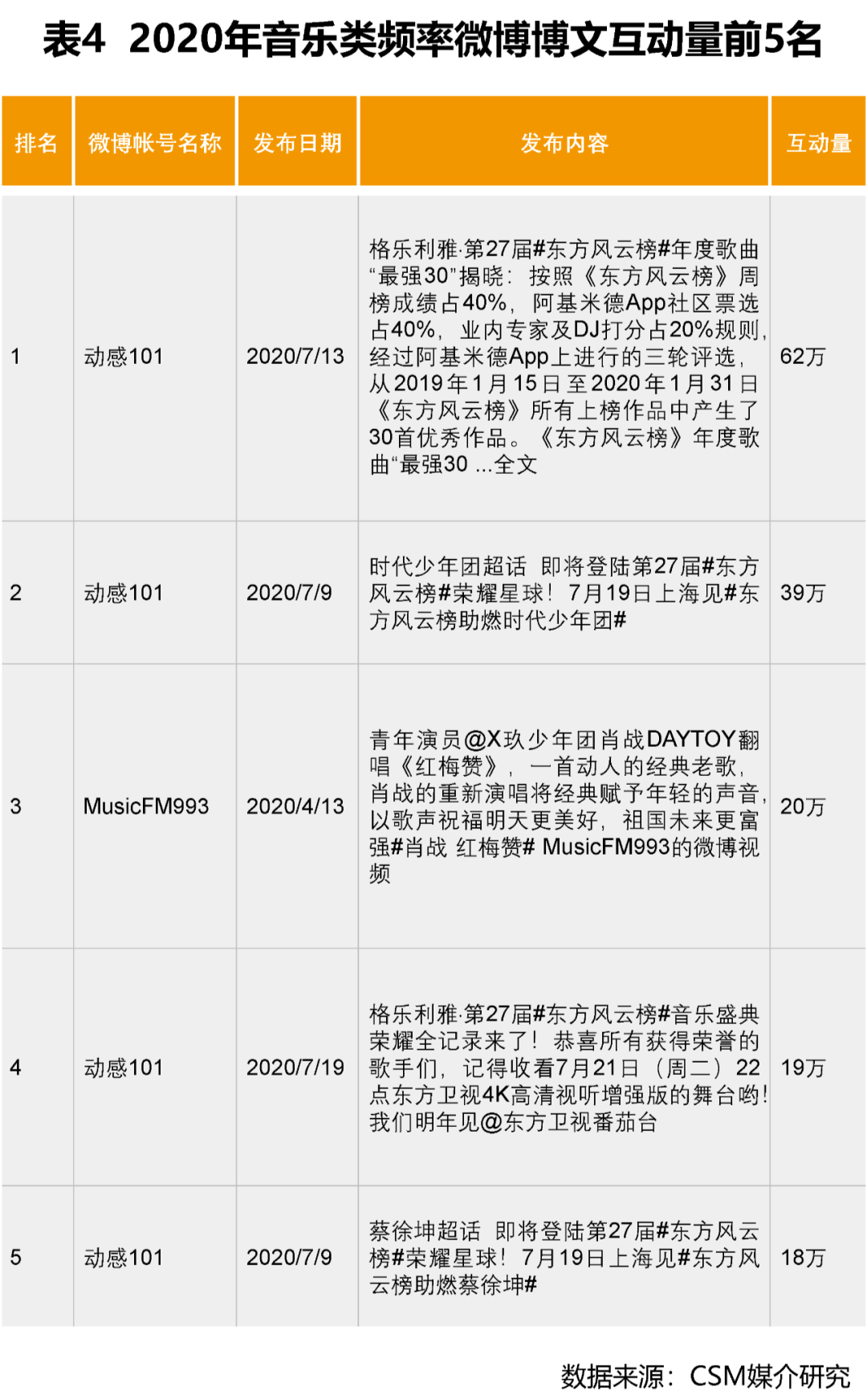 近几年媒体深度融合的进程不断加快,基于“台网并重,先网后台”的发展战略,各大广电媒体持续进行改革,构建内容丰富、覆盖广泛的全媒体矩阵。微博作为一种新媒体传播平台,用户数量逐年上涨,其信息传播的即时性和互动性优势也使得越来越多的广电媒体开始积极运营微博账号,希望以此来争取更多的互联网受众,进一步提升广播频率和广播节目的影响力。对于音乐类频率而言,微博的出现开辟了一条新的音乐传播途径,它能够让更多的用户迅速接触到新的音乐,并加深对音乐作品和音乐相关事件的认识和理解。音乐类频率在微博平台上发布的内容主要为音乐节目预热、活动预告、乐坛明星新闻、歌曲MV等音乐相关内容,借助微博平台与用户密切互动,以此进行频率推广和争取更多用户资源。音乐类频率相关微博账号中,在互动量方面,“动感101”表现最为突出,2020年总互动量超过560万,其发布的【格乐利雅·第27届#东方风云榜#年度歌曲“最强30”揭晓】单条互动量便超过了62万;而“郑州音乐广播”在发博量上遥遥领先于其他账号,2020年共发布微博5.7万余条,收获了18万互动量和926.22亿的全网视频播放量(表3)。《东方风云榜》作为中国最早的流行音乐音乐盛典,如今的影响力依旧巨大,2020年音乐类频率微博账号博文互动量前五位的博文中,由“动感101”发布的有关《东方风云榜》活动内容的博文占4席(表4)。