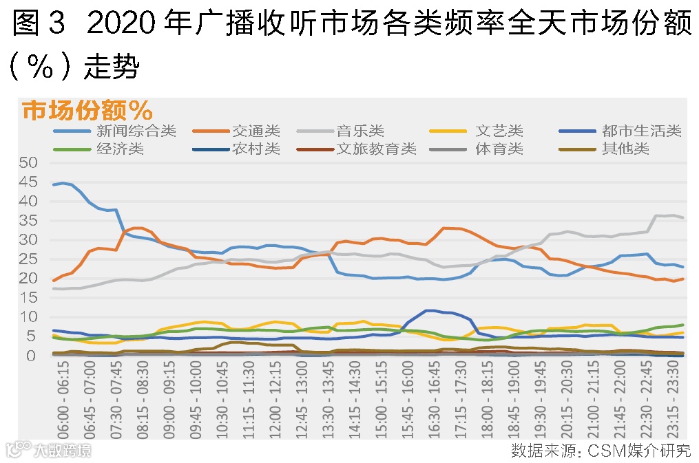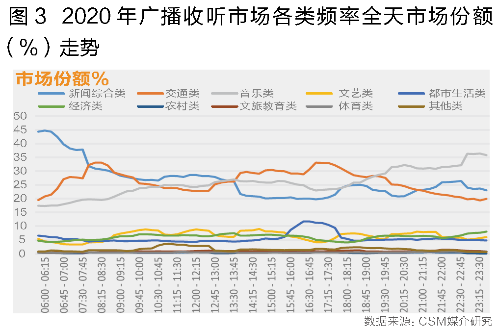 从各类频率全天竞争力走势来看,新闻综合、交通和音乐类频率全天竞争力都高于其他频率。其中,新闻综合类频率早间6:00-8:00时段优势明显;交通类频率全天收听表现比较稳定,上下班高峰时段的竞争力更为强劲;音乐类频率则是从午间时段开始发力,份额一路稳步攀升,直至晚间20:00-24:00时段领先于其他频率(图3)。