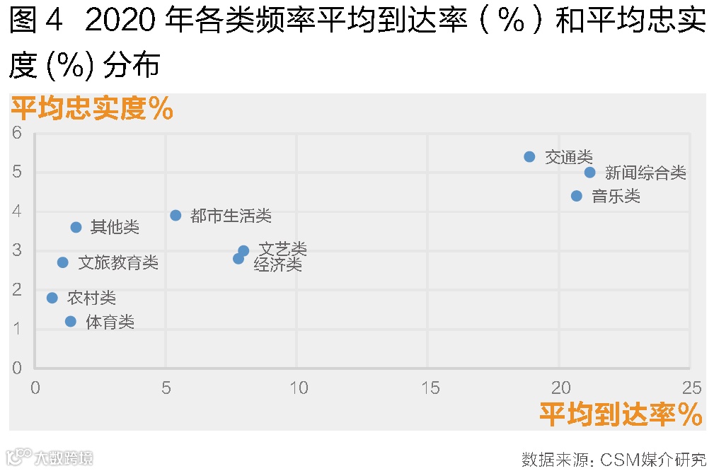 平均到达率和平均忠实度和是考量频率听众规模和听众黏性的两个重要维度,新闻、交通和音乐这三类头部频率凭借其节目资源优势在这两个指标上远远领先于其他频率。音乐类频率在听众规模(平均到达率%)上仅次于新闻类频率,且差距不大;但是在听众黏性(平均忠实度%)上较新闻和交通类频率仍有较大的提升空间(图4)。