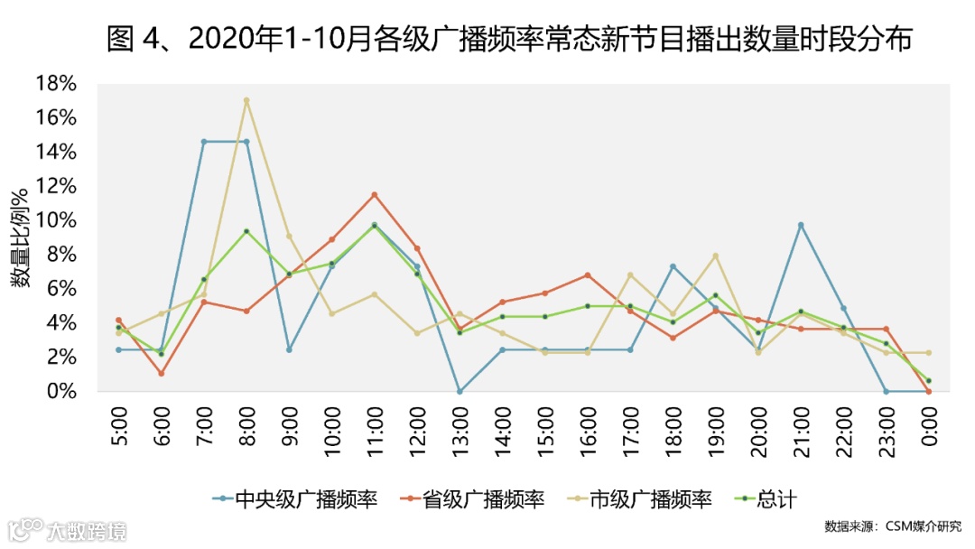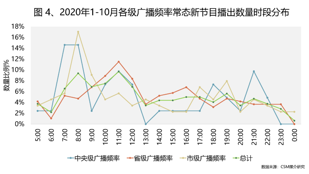 从各级广播频率常态新节目播出时段分布来看,上午07:00-12:00时段是常态新节目开播最为集中的时段,有近50%的常态新节目在这段时间开播。各级广播频率基于自身的节目资源配置、受众收听习惯等,在节目创新时段分布上表现出不同的特征。中央级广播频率常态新节目中,29%开播于07:00-08:00时段,省级广播频率常态新节目中,近30%开播于10:00-12:00时段,市级广播频率常态新节目中,26%开播于08:00-09:00时段(图4)。
