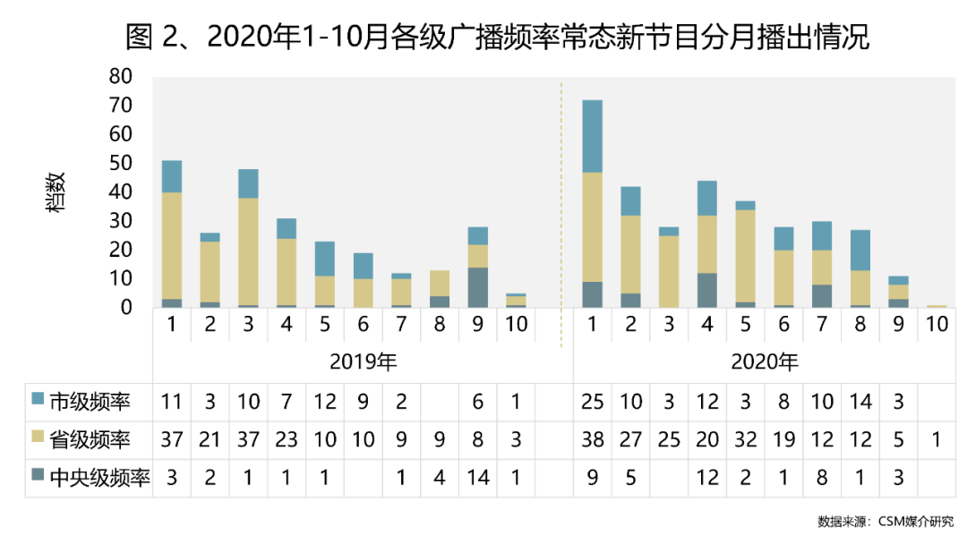 从2020年各级频率每月的常态新节目数量来看,常年创新量处于低谷的6至8月暑假期间较去年活跃不少。统计对象中,由于省级广播频率数量多,其新节目数量也通常较其他频率更多,今年1-10月,省级频率共推出常态新节目191档,较去年同期增加24档,主要集中在1月和5月,分别推出38档和32档,2-4月也都在20档以上。中央级广播频率常态新节目数量共计41档,也较去年同期增长了13档,创新增幅达46%,以4月增长最为突出,作为国家级广播媒体,中央级广播频率不仅承担着正确引导舆论走向、及时传递疫情权威信息的重任,也能凭借自身的节目制作和创新能力,引导受众居家抗疫精神文化产品的消费。与受众日常生活关系最为紧密的城市台频率,也得益于与受众需求的贴近性,在常态节目创新数量上有所提升,共播出常态新节目88档,较去年同期增多了27档,仅1月当月就制作了25档常态新节目(图2)。
