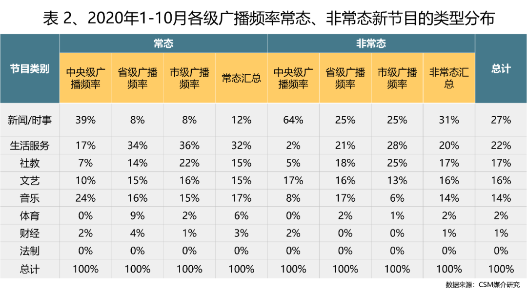 2020年1-10月份,在重大时政新闻和疫情防控的双重驱动之下,各级广播频率的生活服务和新闻/时事类节目创新均较为集中。新闻/时事类新节目方面,无论是常态新节目还是非常态新节目,中央级广播频率均力拔头筹,其常态新闻时事类节目占比39%,非常态新闻时事类节目占比64%。生活服务类常态新节目方面,省级和市级广播频率占比分别为34%和36%。文艺和音乐类常态新节目方面,各级广播频率的创新量占比分布相对均匀(表2)。
