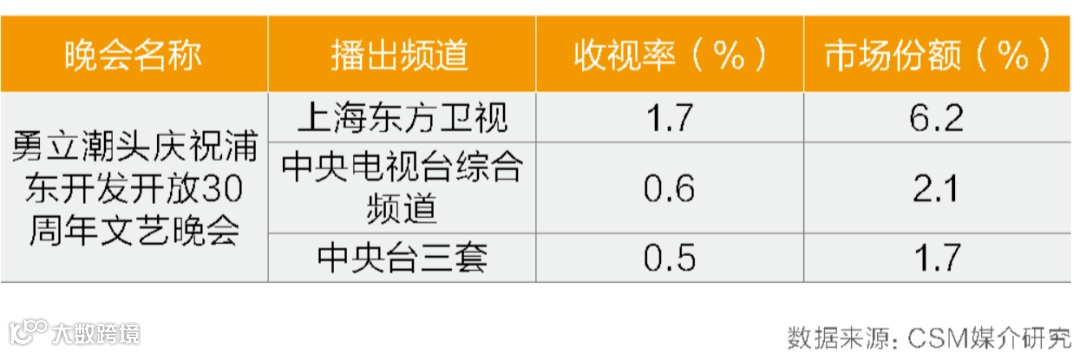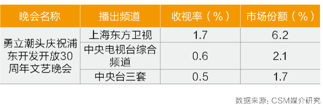 时值浦东开发开放30周年之际,《勇立潮头庆祝浦东开发开放30周年文艺晚会》于2020年11月13日在中央电视台综合频道、中央台三套和上海东方卫视晚间黄金时段播出。其中上海东方卫视收视率1.7%,同时段市场份额6.2%。中央电视台综合频道和中央台三套的收视率分别为0.6%和0.5%。