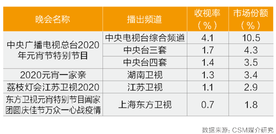 2020年元宵节,全国人民同心战疫,中央广播电视总台的元宵特别节目在中央电视台综合频道、中央台三套和中央台四套并机播出的总收视率达到7.2%,同时段总市场份额18.3%。省级上星频道中,湖南卫视、江苏卫视、上海东方卫视等也都举办了元宵特别节目,其中湖南卫视的《2020元宵一家亲》平均收视率为1.3%,同时段份额3.4%,江苏卫视《荔枝灯会江苏卫视2020》平均收视率为1.1%,同时段份额2.9%,上海东方卫视元宵特别节目的平均收视率为0.7%,同时段份额1.8%。