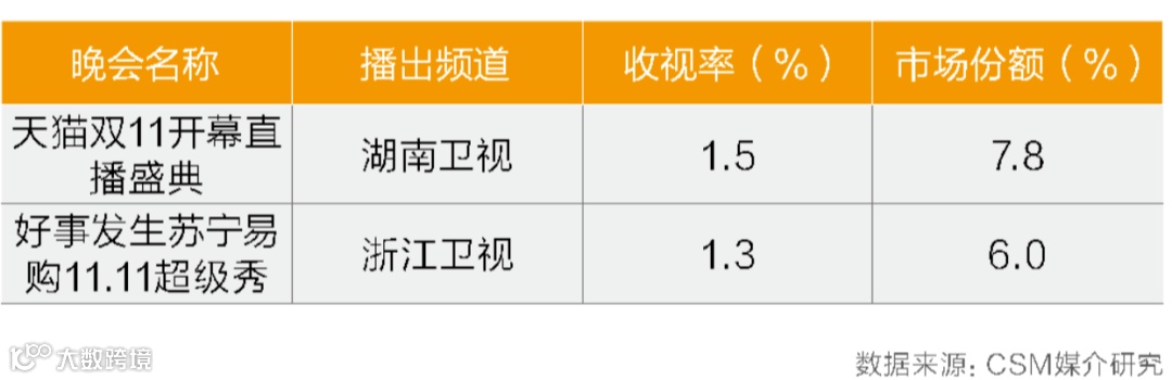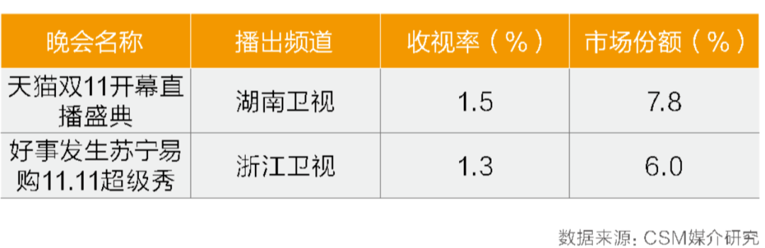 2020年的“双11”电商晚会于10月31日在部分省级上星频道提前拉开序幕,湖南卫视与天猫合作的开幕晚会收视率1.5%,同时段份额7.8%,浙江卫视与苏宁易购合作的超级秀晚会收视率1.3%,同时段份额6.0%。
